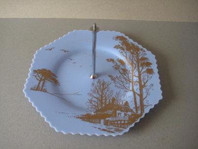 2 tiers, the octagonal plates are a lovely pale blue Lucite (or perspex depending on your preferred trade name) with a picture of an old thatched cottage painted in gold on both tiers. The edges of the plates have an indented shape.
