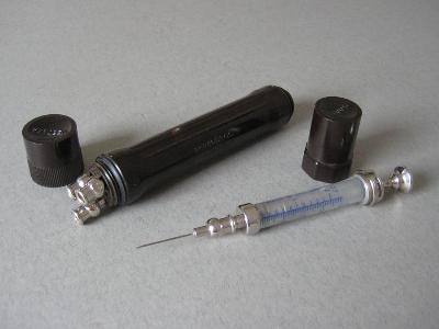 It was made by Down Bros of London and their name appears on the case and on the syringe and needles. There is the reference number P1521 on the outer case. Overall the case is 165mm long and 25mm in diameter.